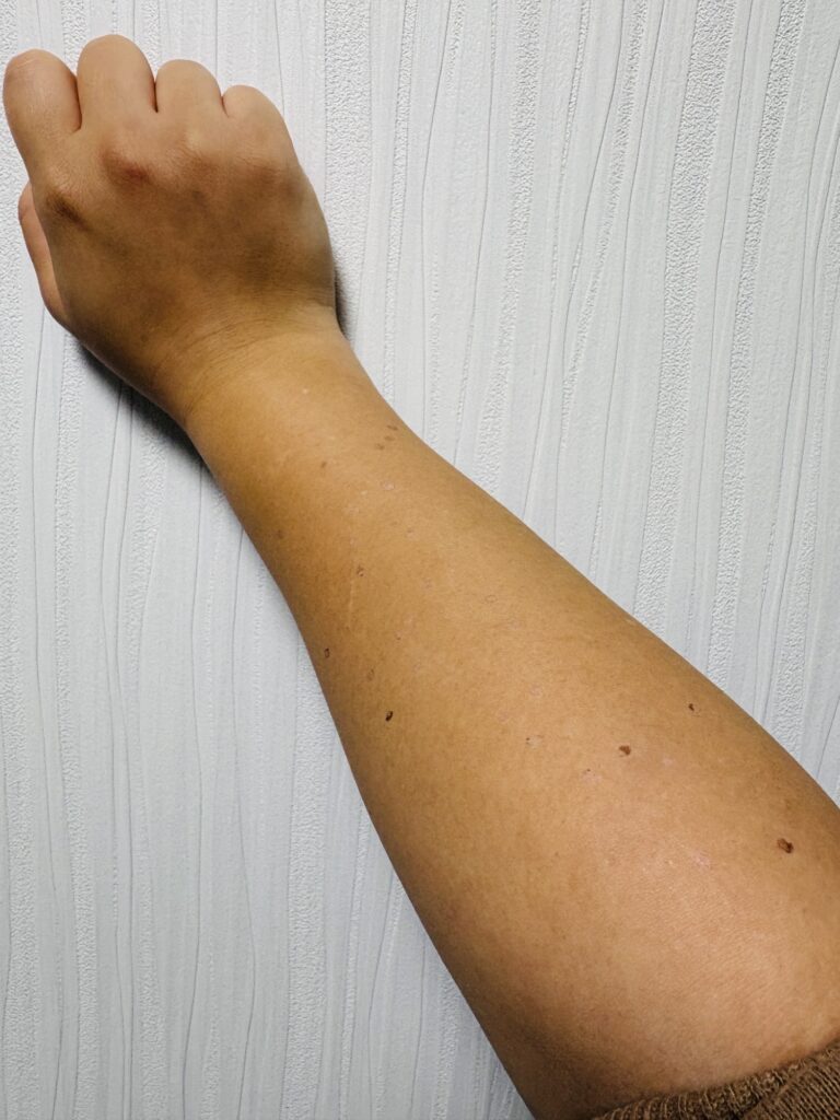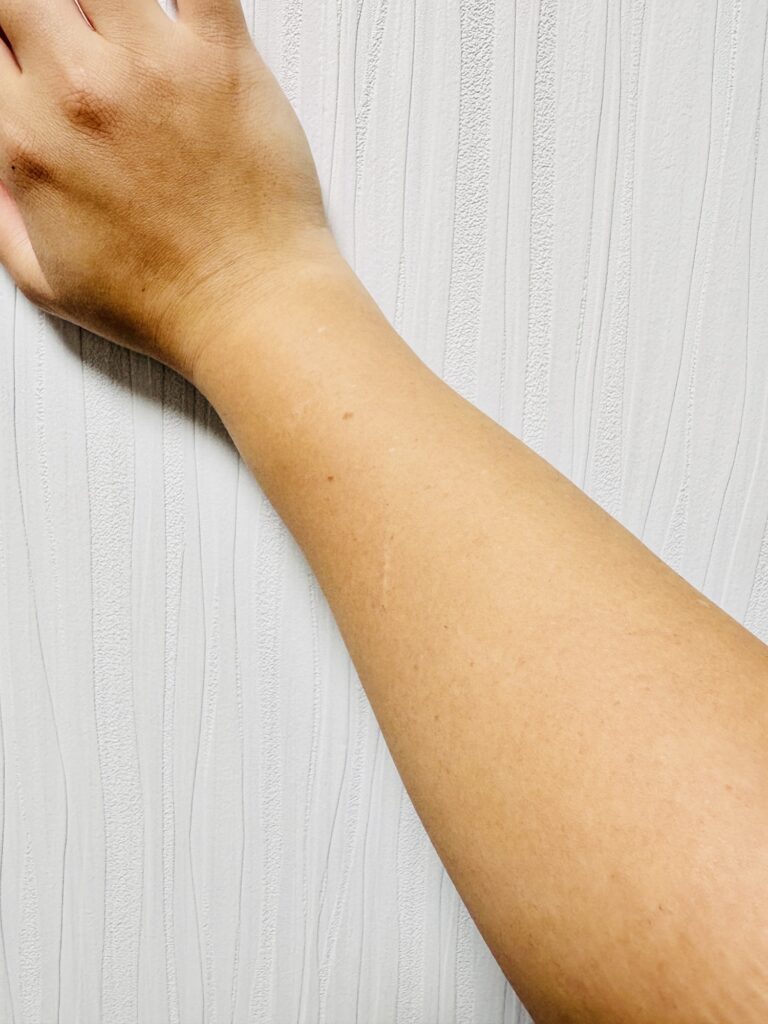 腕のカサブタが取れたあとなんですけど。跡、白っ……。