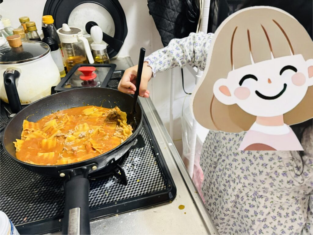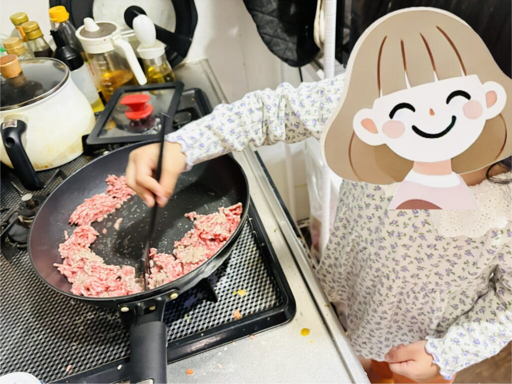 挽肉を炒めつつ、付属のラザニエを入れ、ソースを入れて……。簡単なので4歳児と一緒にできる。