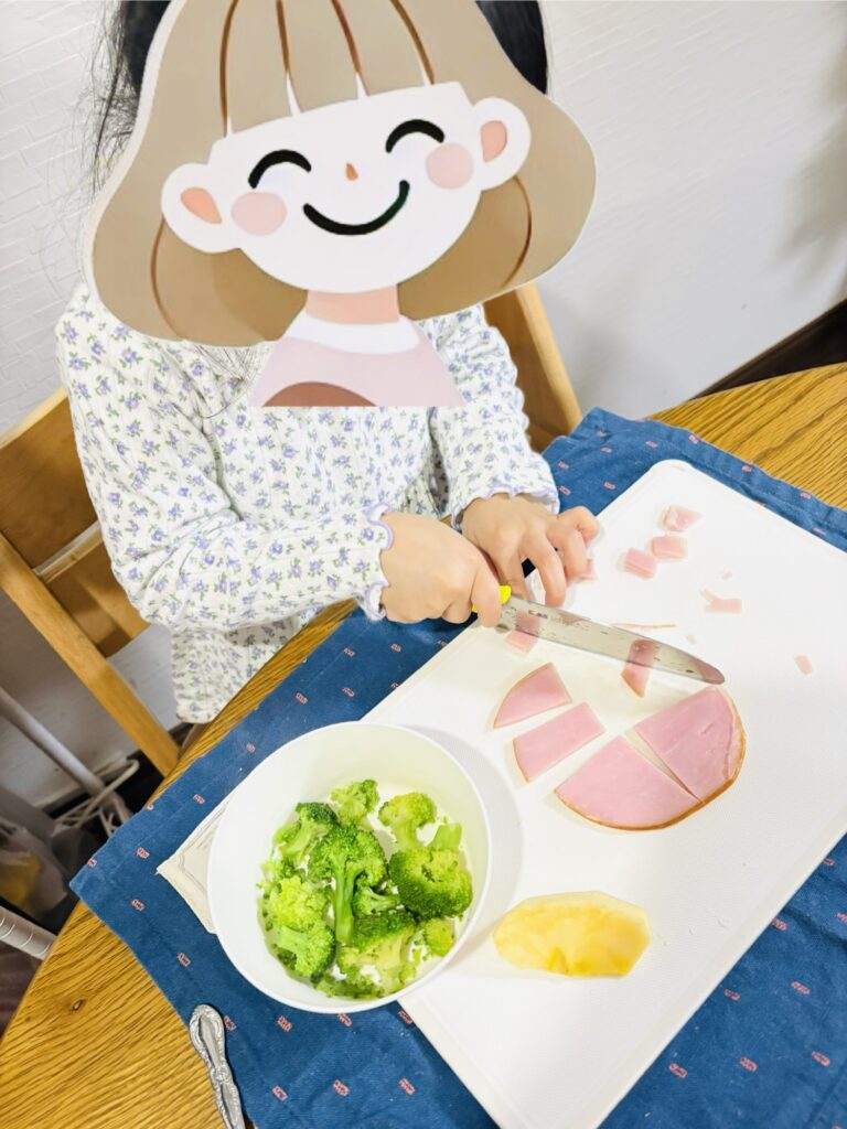 冷凍ブロッコリーをチンして娘にキッズ包丁で切ってもらいつつ(あとハムとりんごもあったので追加した)、