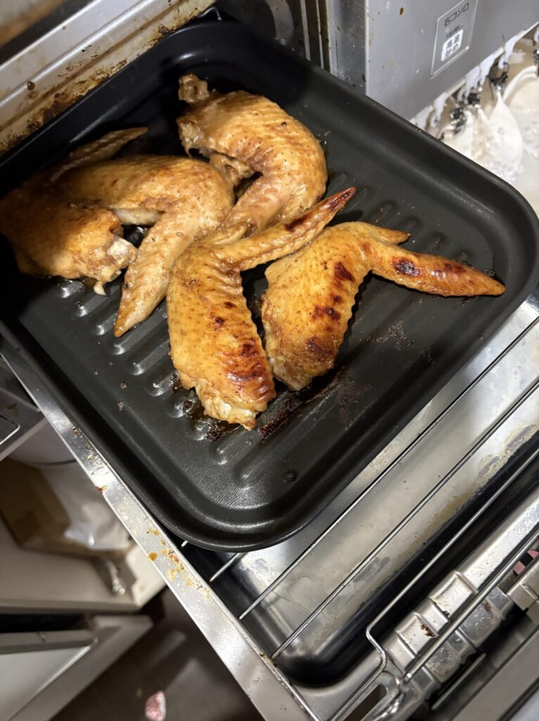 私は手羽先を取り出し魚焼きグリルに入れ、時々タレをシリコンのハケで塗りたくりながらじっくり焼く。
